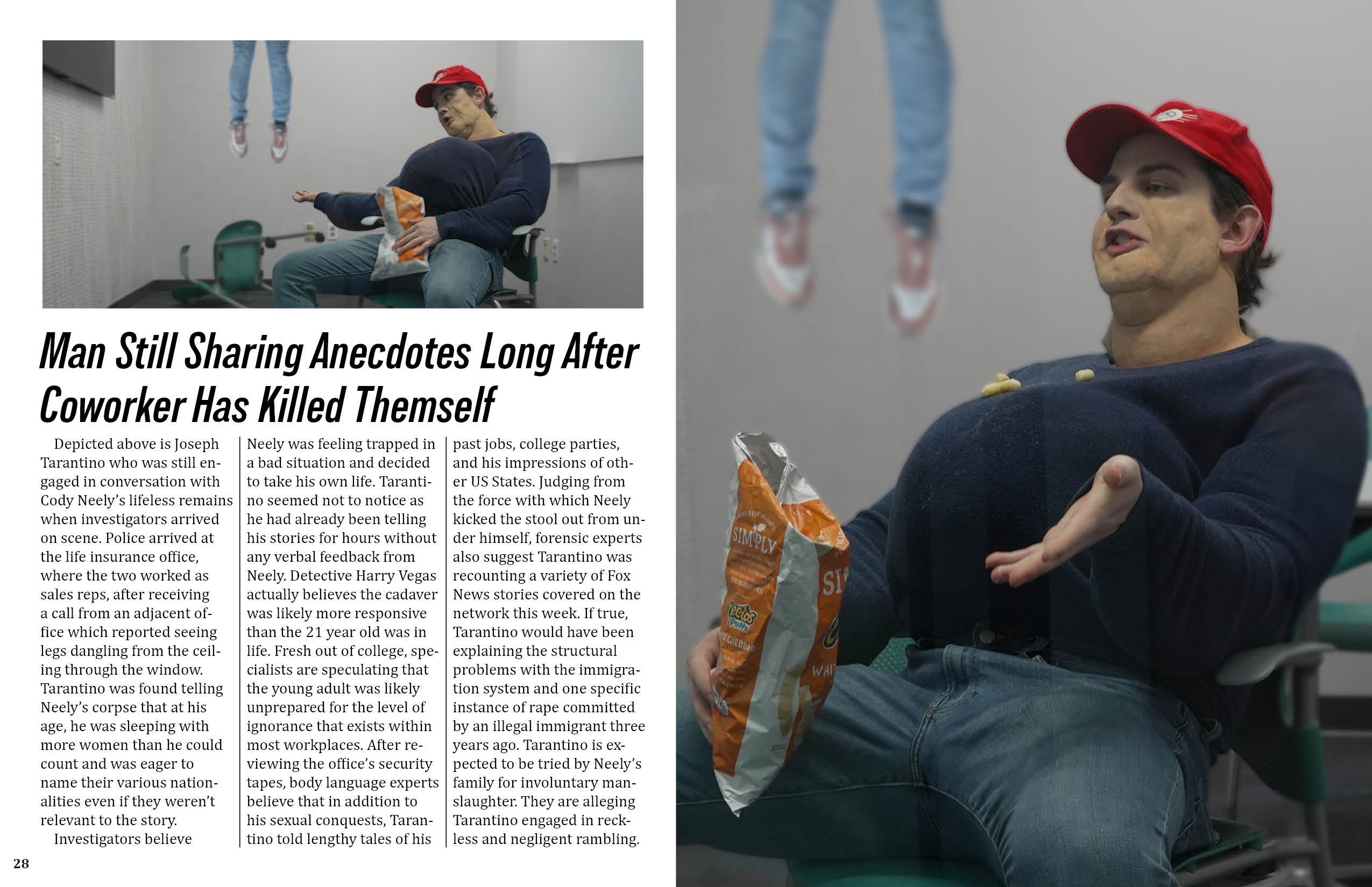 Investigators believe Neely was feeling trapped in a bad situation and decided to take his own life. Tarantino seemed not to notice as he had already been telling his stories for hours without any verbal feedback from Neely. Detective Harry Vegas actually believes the cadaver was likely more responsive than the 21 year old was in life. Fresh out of college, specialists are speculating that the young adult was likely unprepared for the level of ignorance that exists within most workplaces. After reviewing the office’s security tapes, body language experts believe that in addition to his sexual conquests, Tarantino told lengthy tales of his past jobs, college parties, and his impressions of other US States. Judging from the force with which Neely kicked the stool out from under himself, forensic experts also suggest Tarantino was recounting a variety of Fox News stories covered on the network this week. If true, Tarantino would have been explaining the structural problems with the immigration system and one specific instance of rape committed by an illegal immigrant three years ago. Tarantino is expected to be tried by Neely’s family for involuntary manslaughter. They are alleging Tarantino engaged in reckless and negligent rambling.