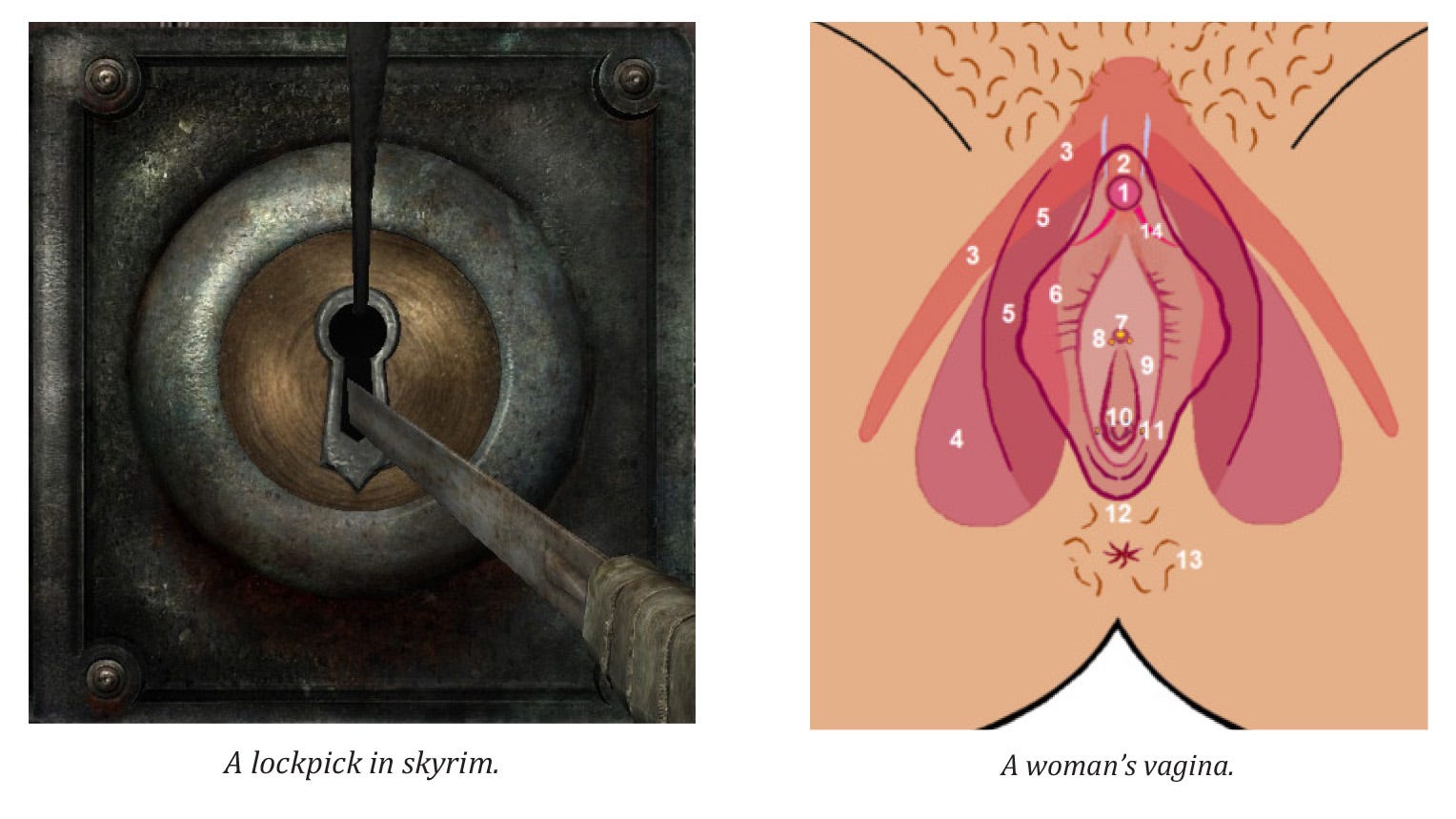 Besides, vibrators can be fun for you too. If you’ve never tried using a bullet on a woman’s clitorus, it’s a lot like lockpicking in Skyrim—which is still the best RPG minigame to date. You’ve got these two tools, one up top and one in the hole (the bullet and your fingers), and you’re just kind of moving things around a little until something clicks. You’ll know when it clicks. Two meaty legs will crush your hands like a trash compactor and the woman you love will get very loud and frightening. Do not be alarmed. This means you have won. This is the equivalent of the chimes that accompany skill leveling in Skyrim. You have gained experience and you are one step closer to becoming the Dragonborn.