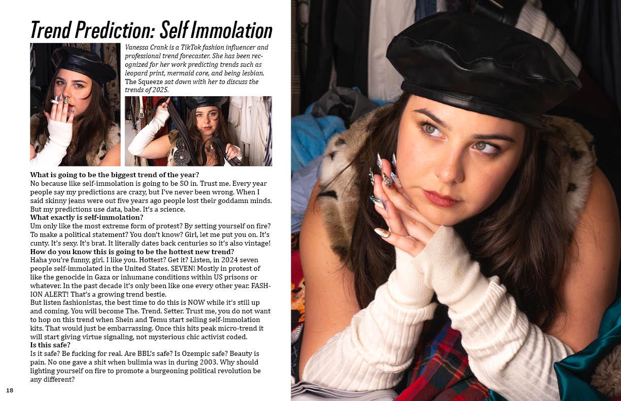 Vanessa Crank is a TikTok fashion influencer and professional trend forecaster. She has been recognized for her work predicting trends such as leopard print, mermaid core, and being lesbian. The Squeeze sat down with her to discuss the trends of 2025.